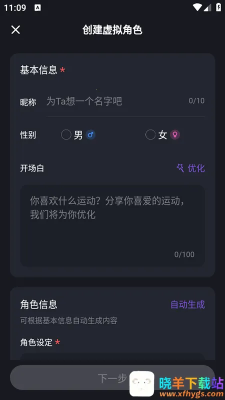 2.进入角色创建页面,填写昵称、选择性别,设置角色设定,并选择角色分类。