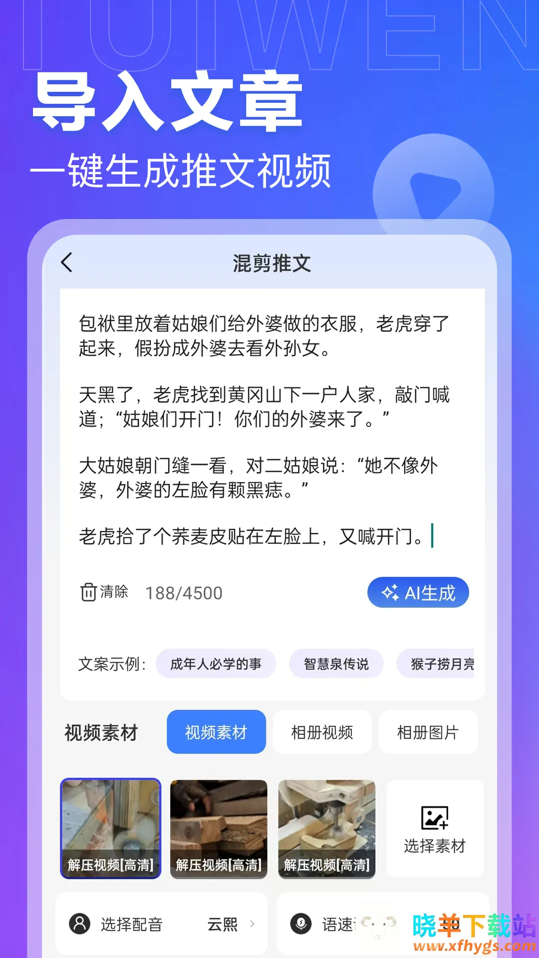 4. 素材丰富多样:提供多种视频素材、配音选择,生成多种风格内容。
