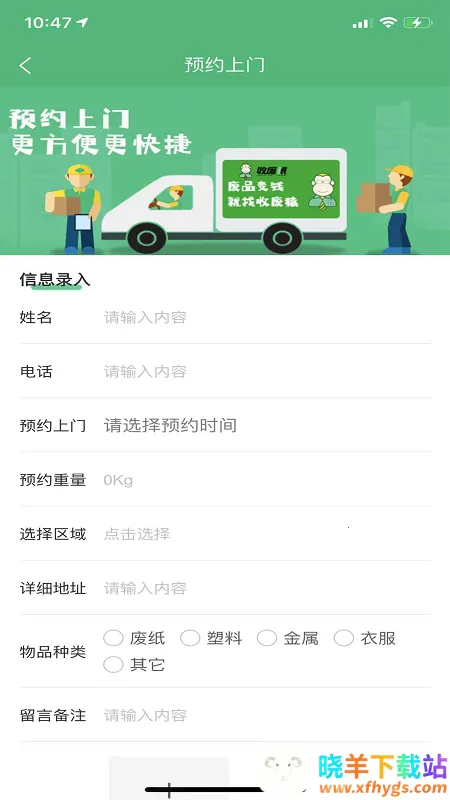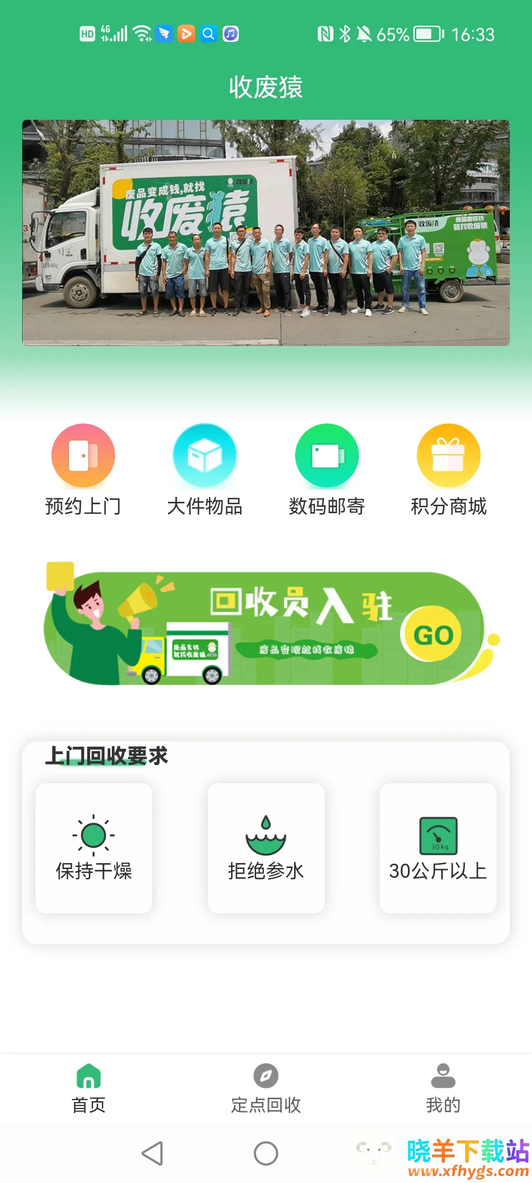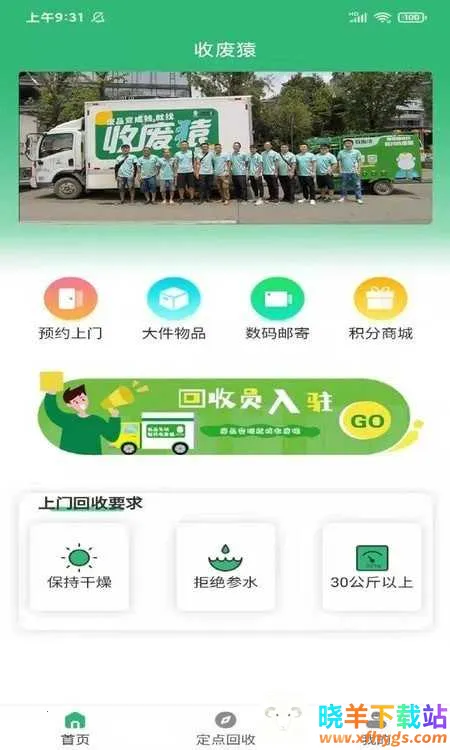 收废猿 2026 官方最新版本是一款实用的废品回收软件。可一键预约上门回收,有详细流程规则。能打造完整回收生态链,支持分类定制,各地区皆有服务,还能让碳减排可视化,方便用户清理废品、环保变废为宝。