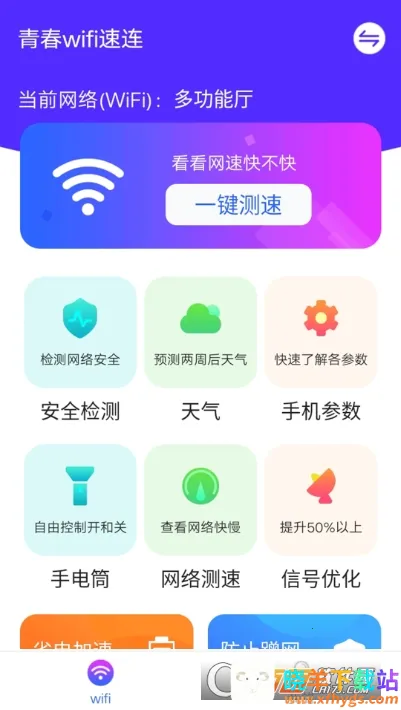 青春wifi速连是专注网络管理与手机性能优化的工具,集WiFi智能连接、网速监测、病毒查杀等多功能于一体。无广告干扰且免费,操作简洁,支持多SSID智能记忆、网络健康诊断,能提升用机体验。