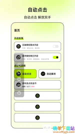 连点xClick是安卓平台自动连点辅助工具,通过无障碍服务模拟触屏操作。能自动完成重复点击任务,可调节点击频率,记录操作路径,有悬浮球等控制。操作简单,参数自定义丰富,低权限运行,适合游戏刷资源等场景。