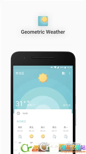 几何天气是一款简洁专业的手机天气预报应用。它能查看未来15天天气及24小时内温度、天气变化、空气指数等信息,支持全球所有城市,数据可靠。其界面清晰简洁,操作简单,无广告干扰,给人纯净使用体验。