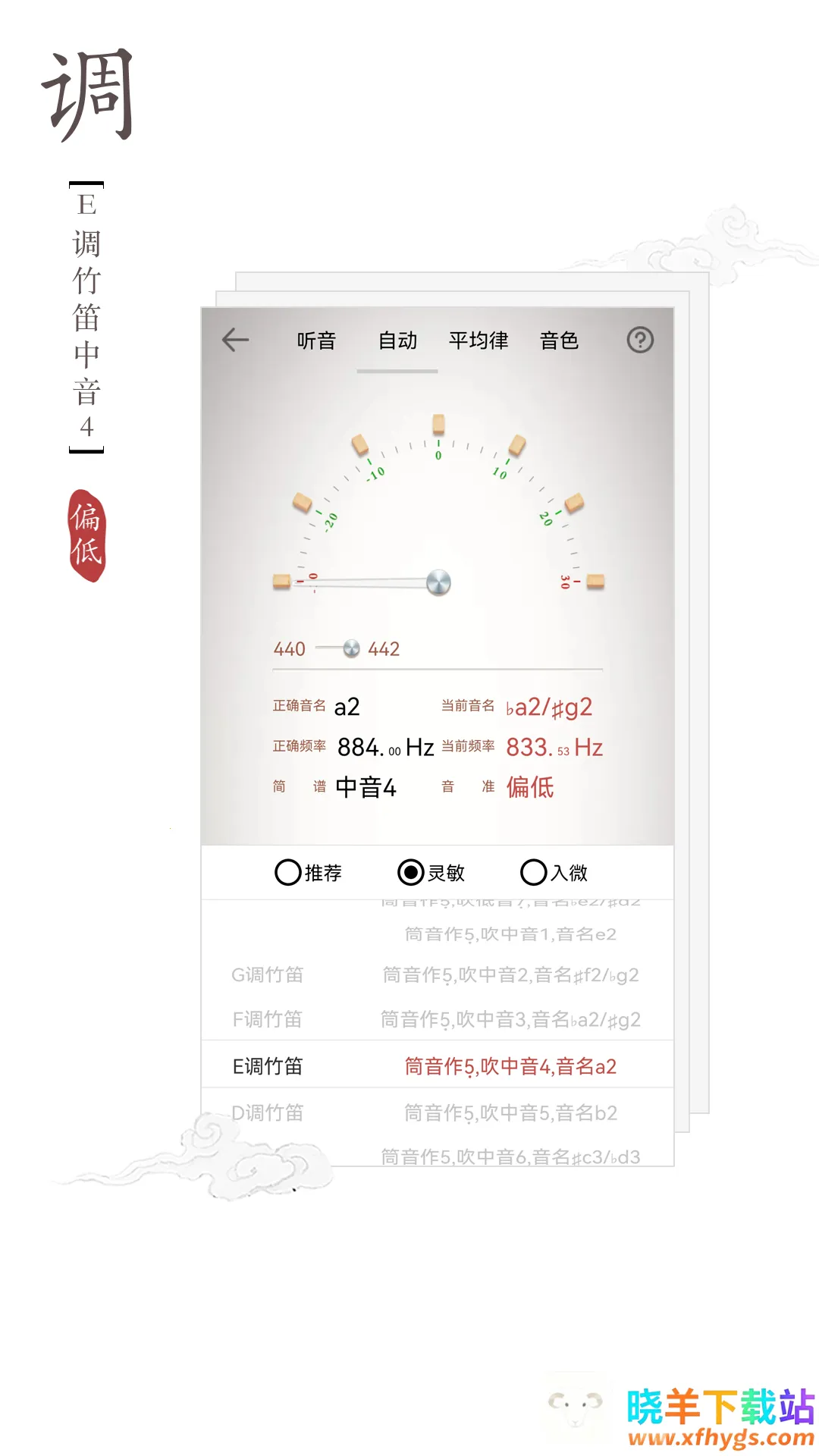 竹笛调音器2026官方最新版本是一款专业竹笛调音软件,能根据竹笛音色分析,与预设标准音对比,以多种形式反馈音高偏差。有多种调音模式,标准音高权威,操作简单,还能在线试听,满足竹笛调音需求。