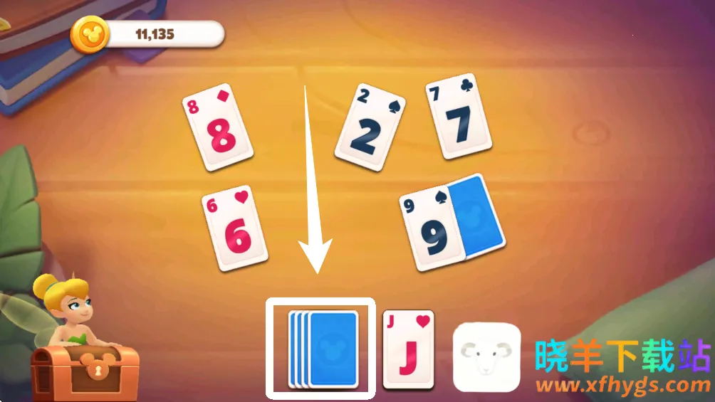 4、以上是教学关卡会比较简单,如果你遇到下图的情况,场上没有可以收的牌,这时候就可以点击左边的牌堆,获得新的牌。