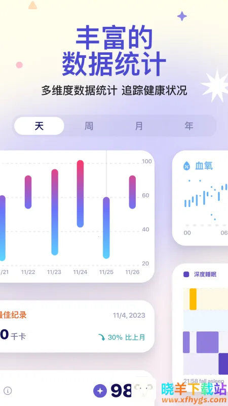2、健康追踪全面:自动追踪睡眠、锻炼、压力、HRV、经期、喝水等十余种健康数据,提供专业分析,助用户全面了解身体状况。