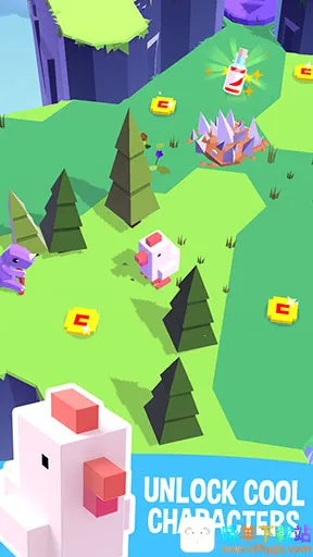3. 精美画面:清新简洁的3D像素风画面,色彩组合完美,草丛土地等障碍物立体有层次感,人物造型可爱活泼,色彩背景缤纷明亮。