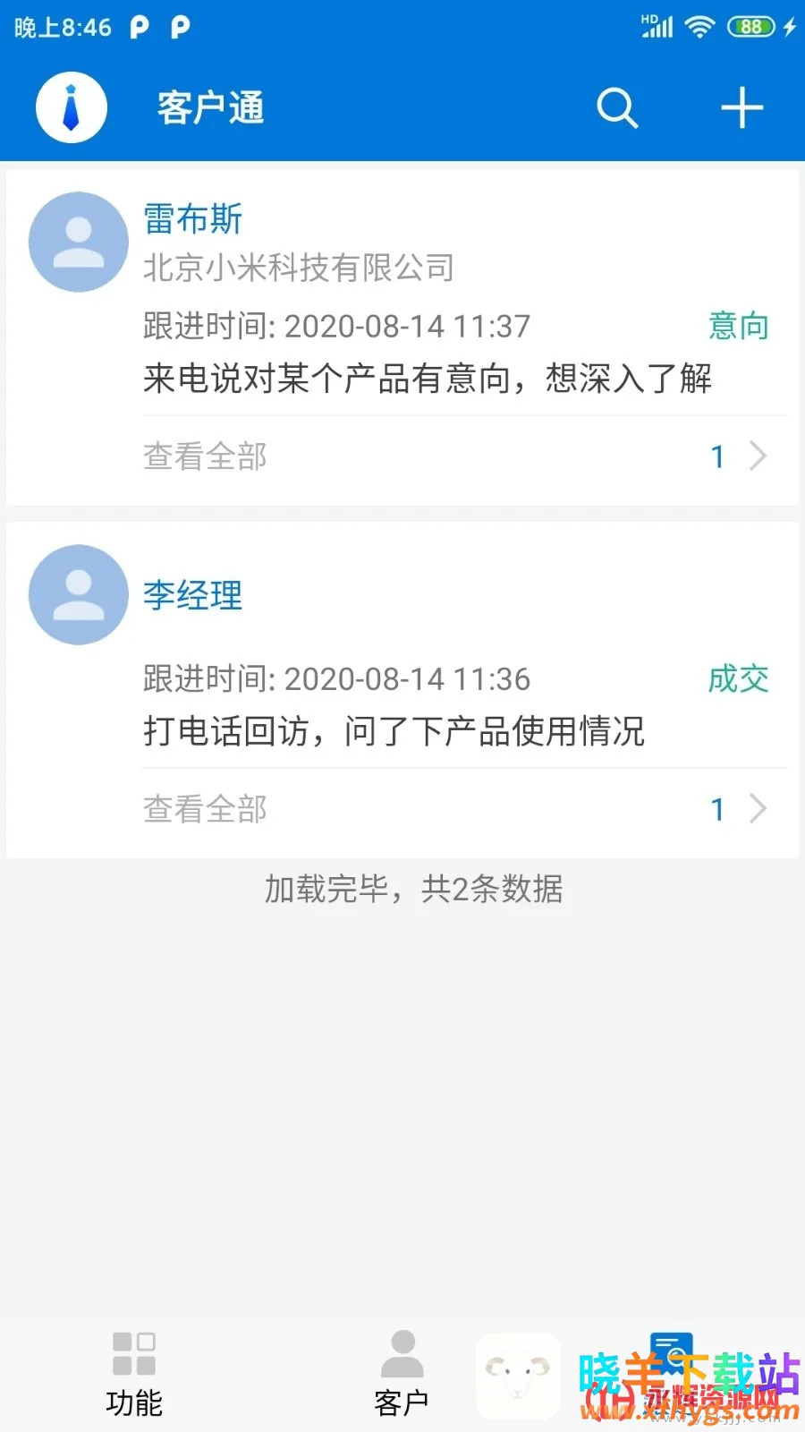客户通是一款专业的客户关系管理软件,适用于广大销售人员。它提供了强大的一键搜索功能,输入客户姓名即可直接查询。所有聊天记录都会保存,方便用户更好的区分和管理客户。还有云备份功能,可以备份一些文件内容,让你不怕文件丢失。客户通支持记录重要事件和会议,并提醒用户不要忘记。您可以更简单地管理您的工作,所有功能都可以在线免费使用。客户通还提供了服务器备份恢复功能,让您不再担忧客户资料丢失,手机丢失的顾虑,随时随地备份恢复数据。同时,客户通还提供了Excel导入,导出数据的功能,让您的录入更加便捷,高效。