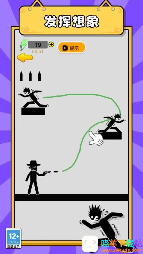 1、观察子弹数量以及敌人所在的位置,用笔绘制出子弹的射击路径,即可击中敌人。