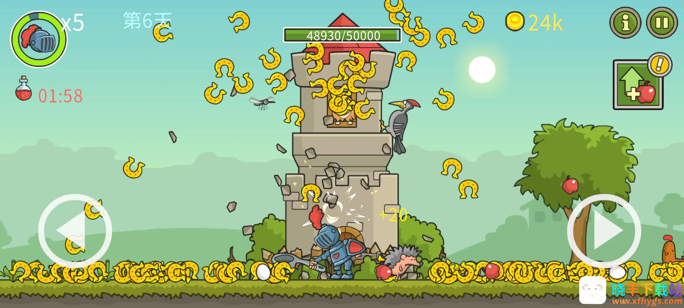 《城堡破坏者(骑士救公主游戏)》是一款放置类小游戏,玩家扮演骑士拯救公主,需摧毁高塔,收集食物增强英雄力量,借助升级助手尽快完成任务,争做第一名救出公主的骑士。