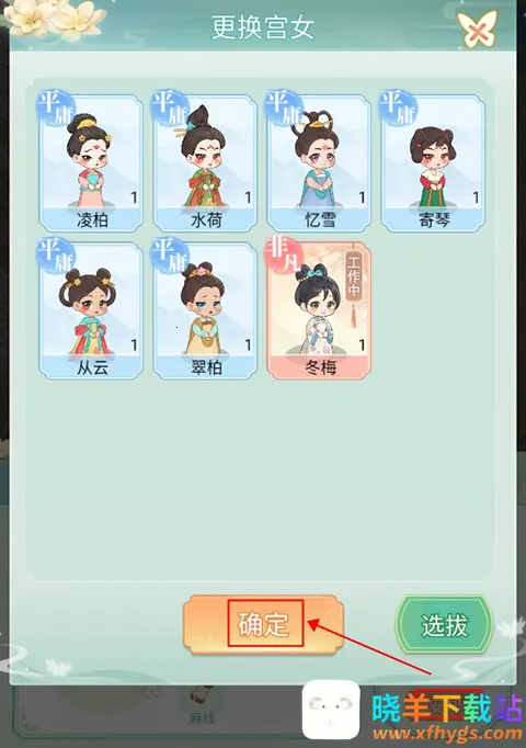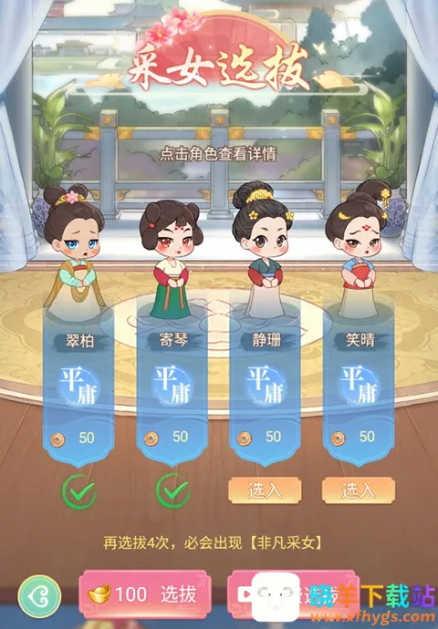 1、玩家点击右下角的选拔即可进行采女的选拔,选择合适的采女加入宫中进行工作。