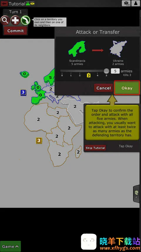 8、点击ok以确认命令并使用所有五支军队进行攻击。当进攻时,你通常想用至少两倍于防守领土的军队进攻。