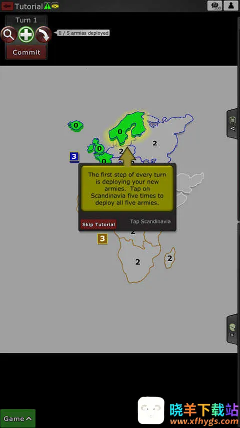 5、每个回合的第一步是部署你的新军队,点击斯堪的纳维亚半岛五次部署所有五支军队。