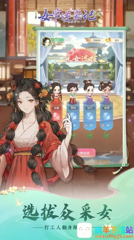 2、选拔培养采女:游戏中有丰富的采女可供选拔,选合适的作为宫女培养升级,助力司织房发展,增添游戏策略性。