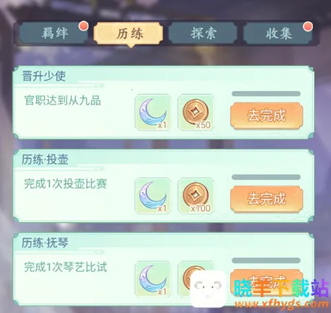 历练成就目前只有官职、投壶、抚琴三个成就任务,完成就可领取成就奖励。