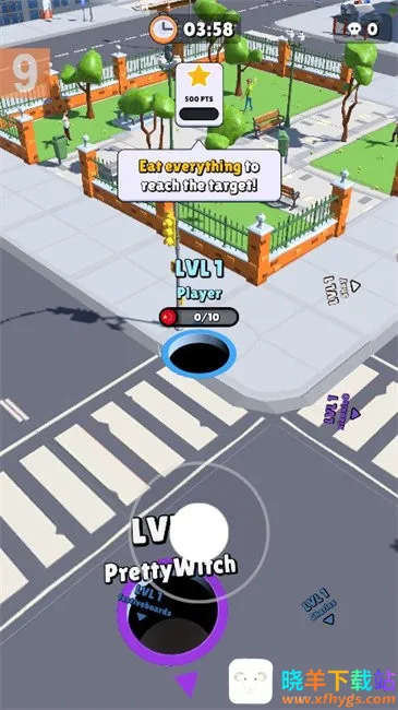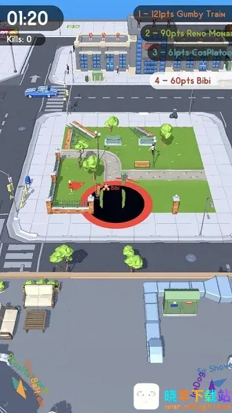 黑洞大作战是一款令人上瘾的免费街机游戏,支持线下随时畅玩,多玩家实时同场竞技,通过吞掉对手来实现绝地求生。玩家需操控黑洞在城市中吞噬物体不断成长,并与其他玩家实时对战,目标是在限定时间内成为体积最大的黑洞。它跟以前的贪吃蛇类型游戏类似,各自操控黑洞吞食物品及对手,每局有时间限制。黑洞会慢慢放大,开局先吃小物品,如杆子、报亭,变大后再考虑汽车和房子。玩家在地图中要不断移动寻找可吞噬之物,增加黑洞体积,沿道路找东西时,要尽量避开比自己黑洞体型更大的对手,因为竞争对手可互相吞并。游戏操作简单,玩法模式多样,能玩单人单机模式,也可联机和他人竞技,其新颖的玩法和简单的操作很容易上手,卡通风格画面也给人带来不错的视觉体验。