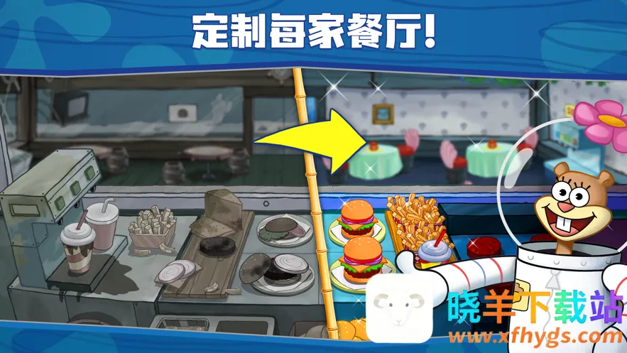 **海绵宝宝大闹蟹堡王中文版下载**特色十足。正版授权,带你进入比奇堡开启趣味料理冒险。经典人物齐聚,蟹老板、派大星等依次登场互动。采用经典模拟经营玩法并融入独家剧情,能参观地标制作美食。数百道美术关卡助你制作同款佳肴,掌握厨艺成大厨。还有超自由DIY玩法,可设计餐厅、为居民换服装,享受DIY乐趣,精美画面让你沉浸式体验比奇堡开店的快乐。