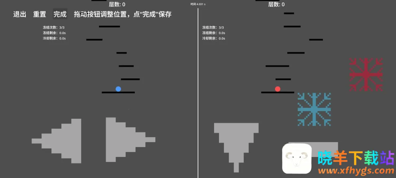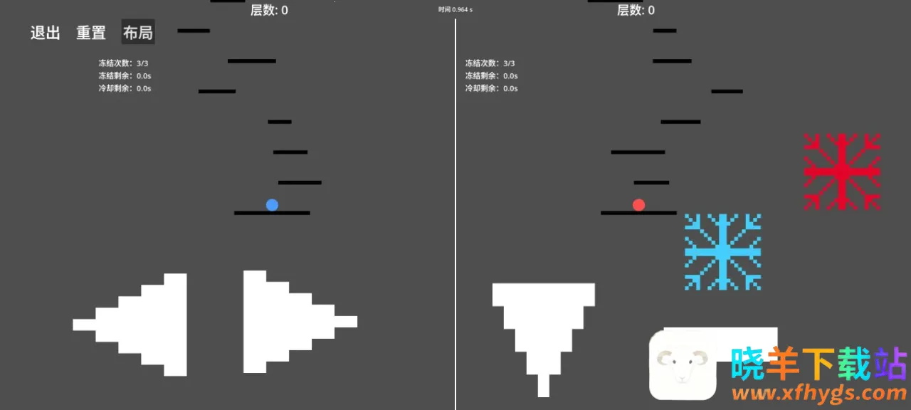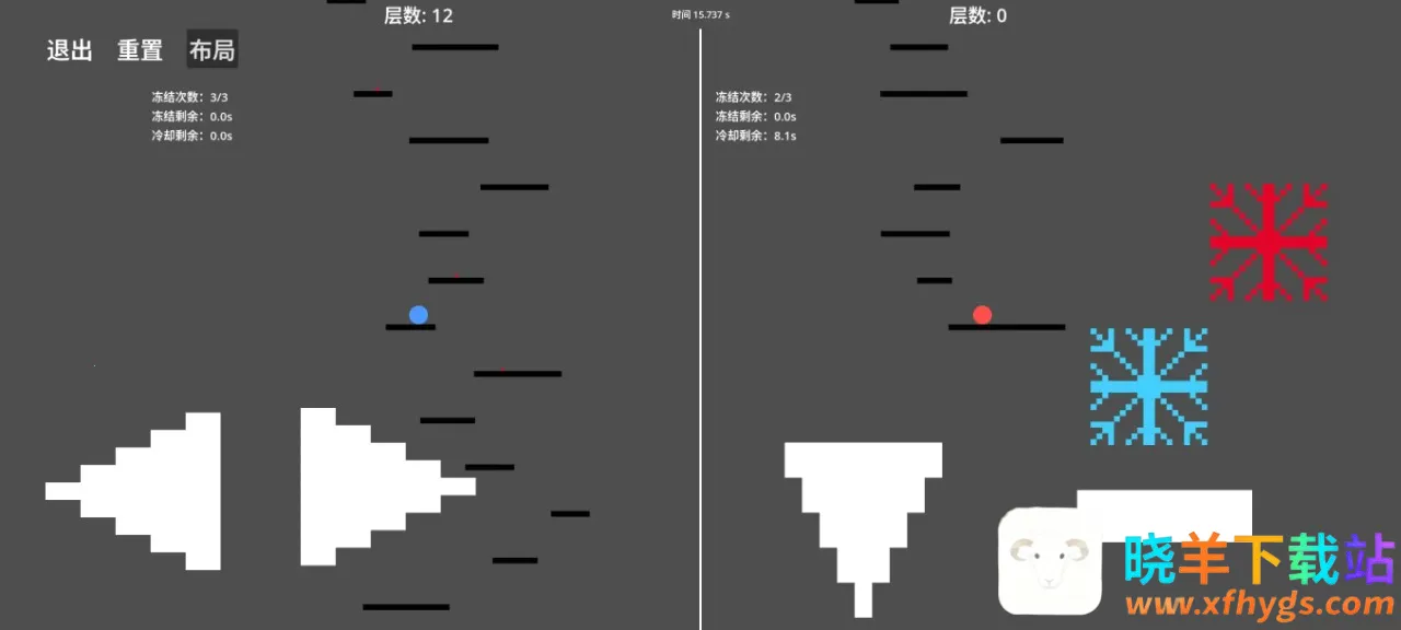 这是一款操控双球跳跃挑战的游戏。胜利条件是两边球同时碰到第100层白门,在此之前,任意球碰到地刺或掉下第0层平台都会失败。手机端操作针对正常世界,按键控制移动、下落和跳跃,还有冻结技能。电脑端用WASD和方向键控制,Z、C键分别是左右世界冻结键。因工程量问题,电脑端暂未开放自定义键位。每次重置游戏,平台随机刷新,游戏略难,会记录最快登顶时间,可挑战自我极限。按下布局选项能自由调整按键位置适配不同手机分辨率,且无背景音乐。整体来说,它能让玩家体验操控双球挑战的紧张刺激,不断突破自我,尝试创造更快登顶记录,享受挑战极限的乐趣。