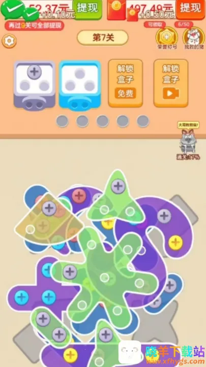 想轻松赚钱又能享受乐趣吗?那就来试试“抓了个猪赚”游戏吧!它是一款超有趣的休闲解压游戏,以三消玩法为主。把相同颜色的螺丝放到对应位置完成消除,就能套小猪啦。游戏得分越高,套到的小猪越多,还能用小猪兑换红包奖励呢!