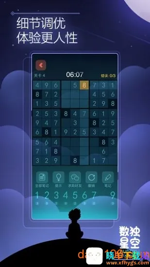 数独星空是一款手机休闲益智数独游戏,画面精致简约,以梦幻星空为主题。关卡众多,四大难度自由切换,题目由冠军及名人出题。其空灵音效、独特设计给玩家安静思考空间,还能提升数学能力,老少皆宜。