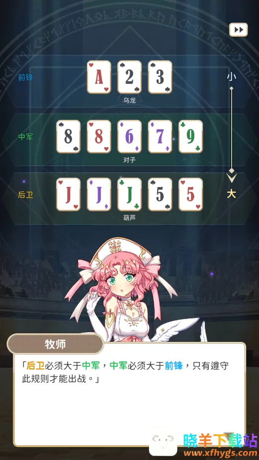 1、游戏中的规则是优先级的,出牌的时候要记住后卫大于中军大于前锋。
