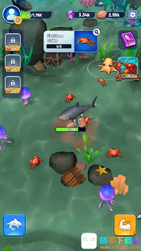 2. 通过吞噬获取食物资源,进而升级解锁更多技能,让你在海洋中拥有强大实力,称霸海洋,吞噬一切猎物。