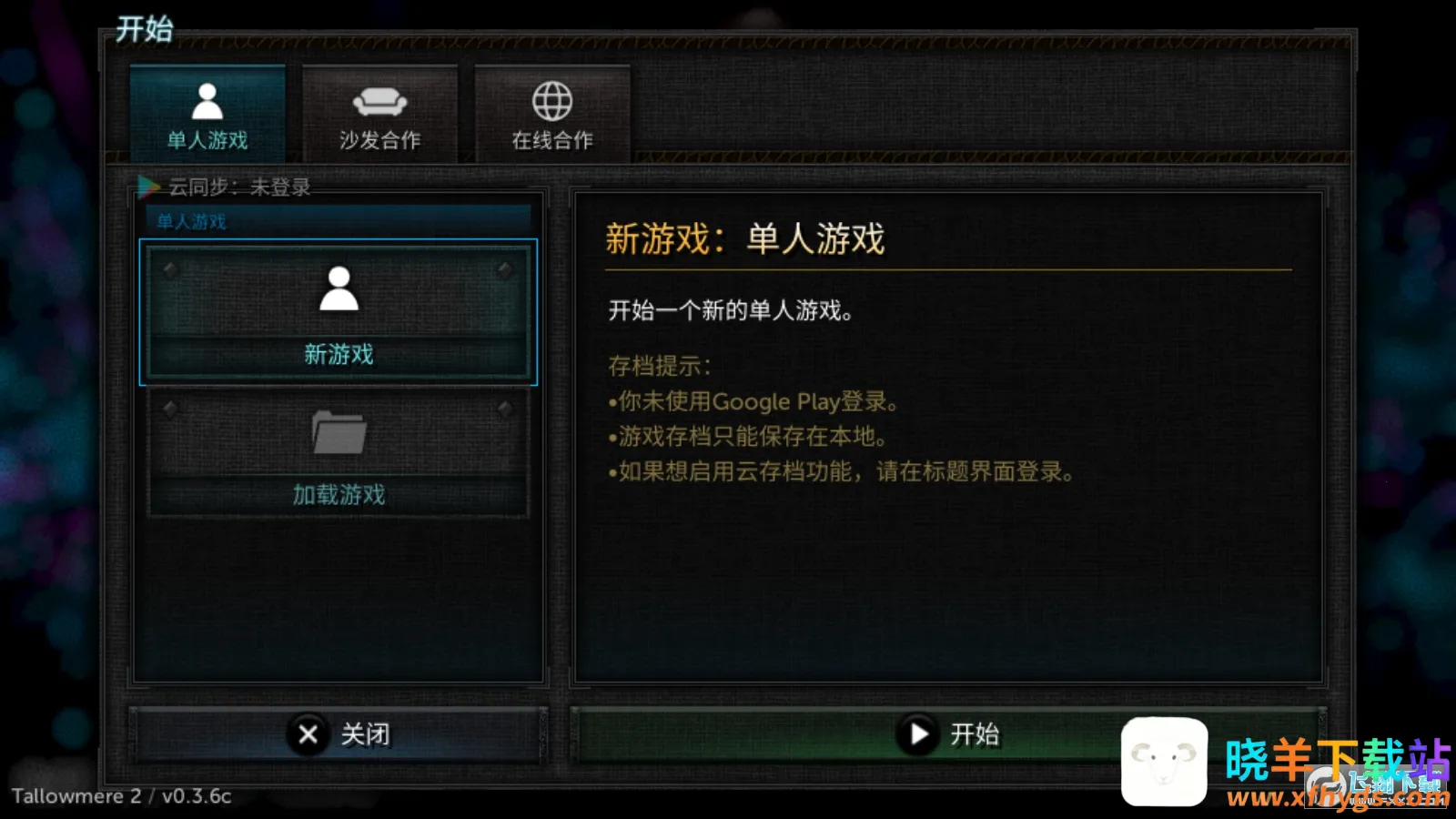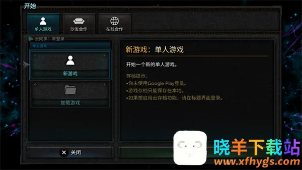 2、游戏总共设置了三种模式,分别为单人游戏,沙发合作以及在线合作,同时还支持使用谷歌账号进行云存档功能。