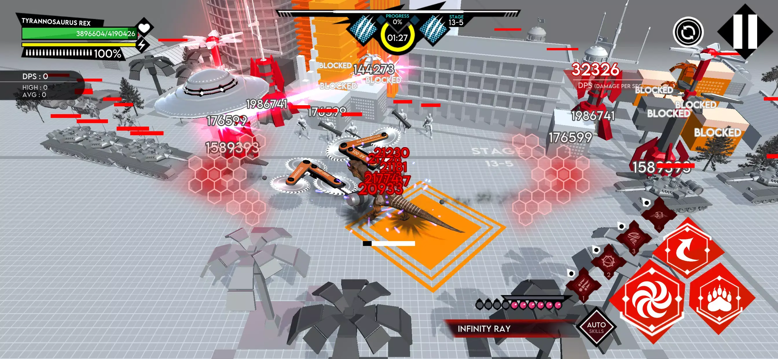 MechaDinoCitySmash是动作模拟游戏,设定在恐龙宇宙,操控基因强化机甲恐龙霸王龙破坏城市。有狂暴行动玩法、UFO支援等,具风格化视觉设计,能升级恐龙进化力量,带来高能破坏体验。