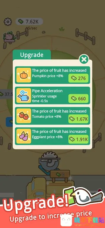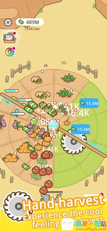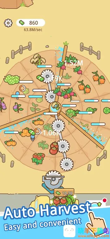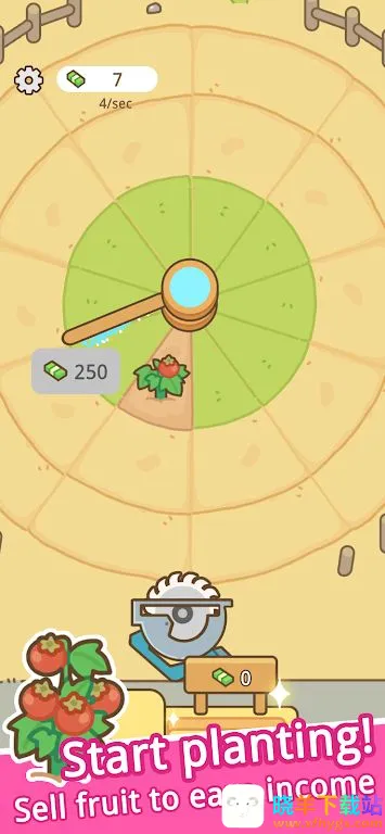 3. 丰富升级体系:通过切成熟农产品赚取金币,用于升级浇水速度,解锁稀有种子,还能自动收割,逐步建立终极循环农业帝国。