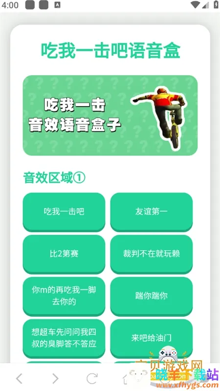 吃我一击语音盒特色满满。海量语音包,涵盖游戏主播四叔的众多语音,让聊天趣味十足。免费播放与分享超贴心,无需付费就能畅享。延迟播放功能很独特,互动更自然。分类清晰,找语音轻松快捷,效率大增。及时更新确保紧跟潮流。语音质量高,清晰无杂音。操作简单,新手也易上手。适用场景广,游戏直播、日常聊天都能添乐。界面简洁,悬浮窗功能方便,使用其他应用时也能随时播放语音,无需切换,超便捷。