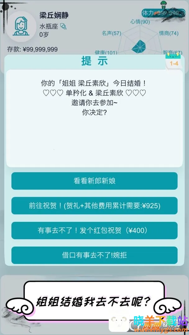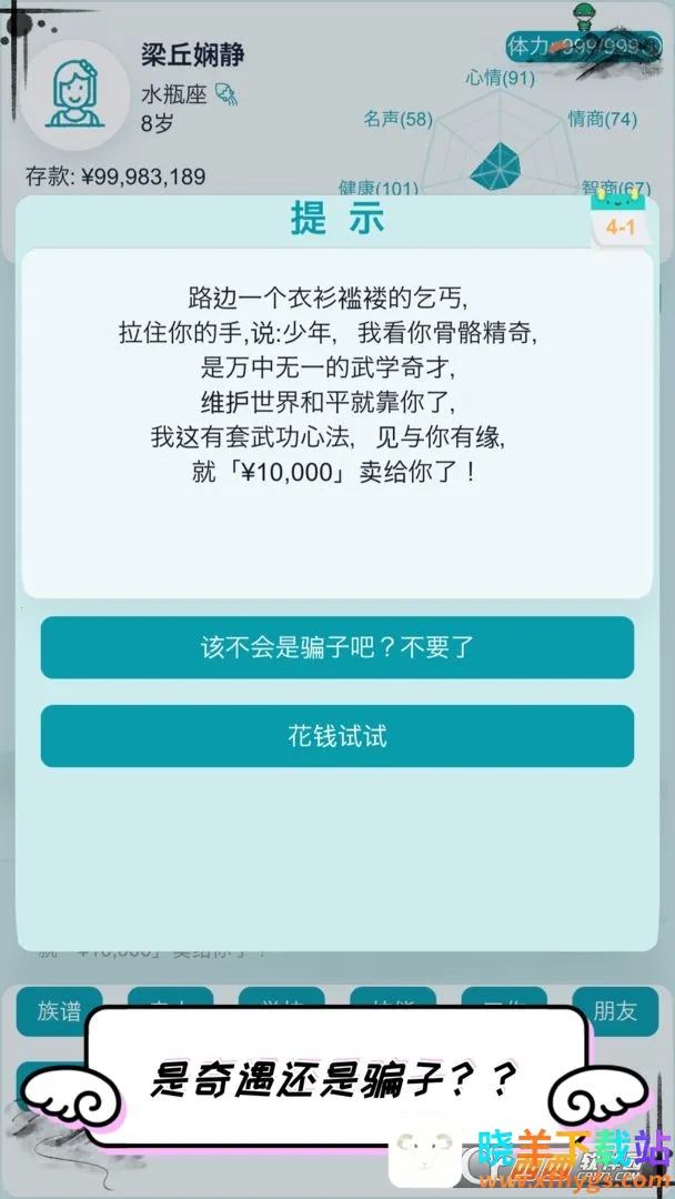 想在自由人生模拟游戏里轻松畅玩?“自由人生模拟器无限体力无限金钱”能满足你!在这款文字模拟游戏中,你能随机开启独特人生。开局就有随机的父母、身份、基因和天赋,充满未知与惊喜。从1岁起,可做各种事,比如学习、交友、工作、结婚生子等。通过点击推进游戏进程,每一年耗费完体力就能点击下一年。有了无限体力和金钱,就能更自由地体验人生。你可以毫无压力地选择心仪的学校努力学习,或是尽情发展各种技能。还能轻松应对生育等需求,按照自己的想法培养孩子。随机事件超多,玩法丰富多样,能让你弥补现实遗憾,尝试百变人生,沉浸在这独特的虚拟世界中,尽情享受自由模拟人生的乐趣。