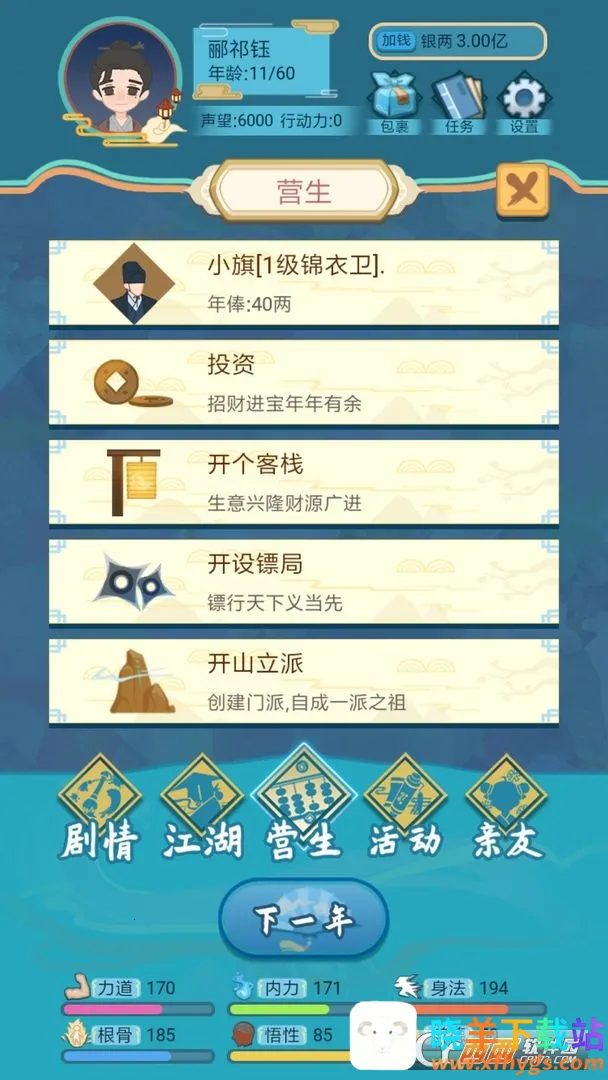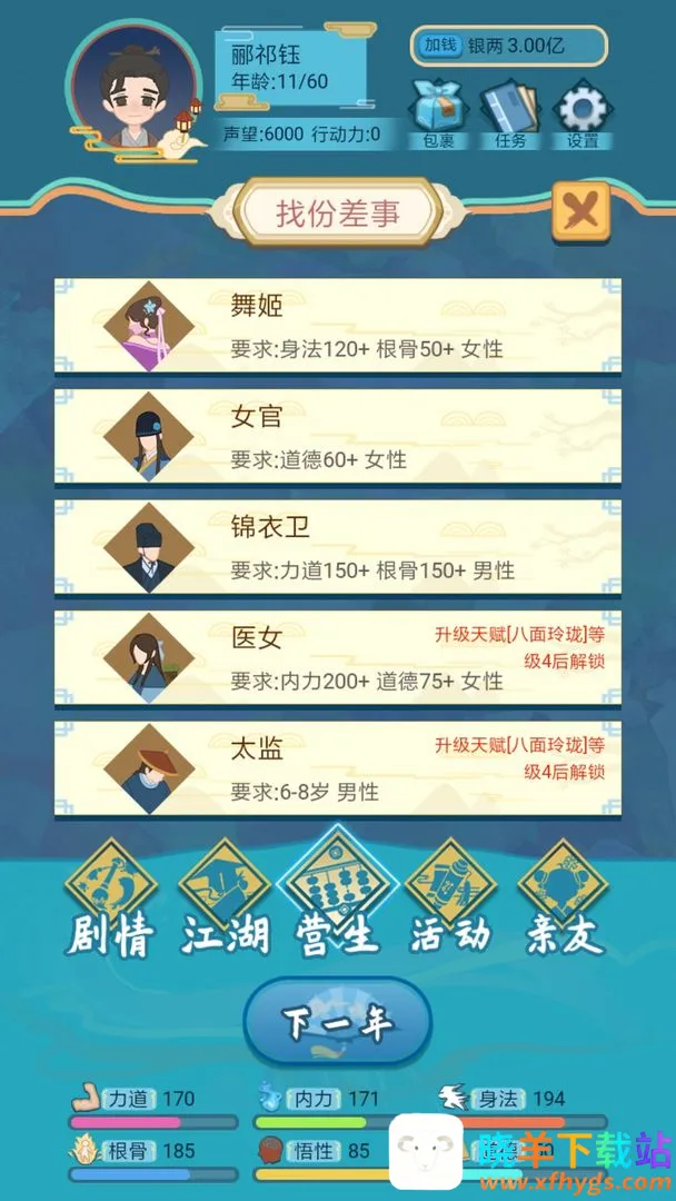 在这个游戏里,玩家可以自由规划人生轨迹,从出生起就能决定每年的行动。可以闯荡江湖拜师学艺,体验各种武侠世界的工作,也可以啥也不干家里蹲。当然,考取武举人、争夺武林盟主、开山立派等也都不在话下。甚至还能当捕快、医女、锦衣卫,或者当个太监!