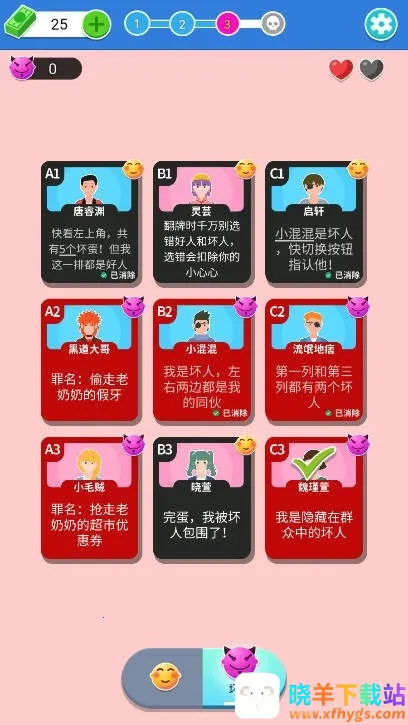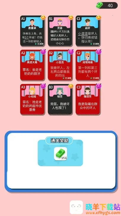 想体验命运的反转吗?那就来试试这款超有趣的游戏!在游戏里,你会置身丰富的悬疑关卡中,挑战重重谜题。前期要和各类人物互动,了解他们的动机,找出卧底,整合线索,解开真相。每个决定都可能带来新线索,推理之旅充满未知。游戏优势满满,选错会扣生命值,连续两次选错就得重玩关卡。随着关卡深入,谜题难度提升,角色增多,线索组合更复杂,还有多种主题谜题,始终保持新鲜感。特色也很突出,能实时与角色互动,根据反应判断。有隐藏线索和彩蛋等你发现,需细心观察思考。还得依情况制定策略,灵活运用推理技巧通关。快来下载,开启你的解谜之旅,感受命运反转的魅力吧!