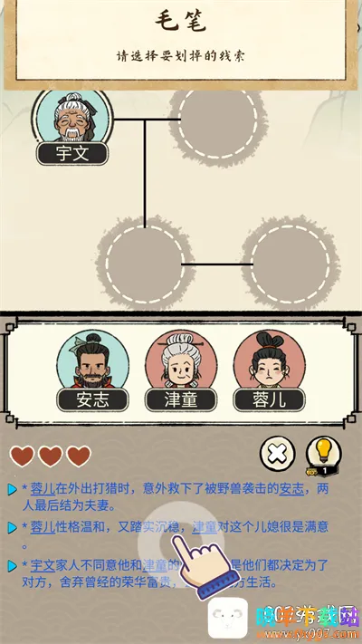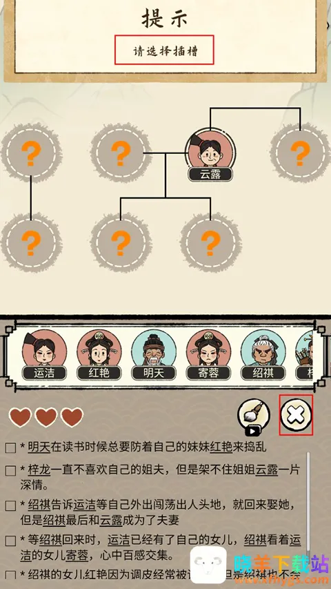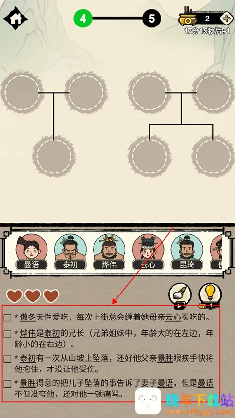 2、进入关卡后,玩家需要根据下方文字提示,将人物头像拖入上方合适圆框内,进行族谱的修缮。