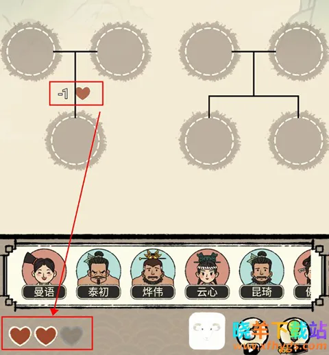 3、如果拖入的人物与圆框不不对应,会扣除血量,三格血量全部扣除即为失败,因此玩家需要小心判断。