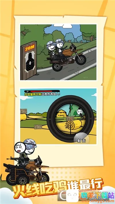 火柴人火线吃鸡是一款火柴人题材吃鸡冒险手游,以剧情导向设计冒险关卡,有射击跑酷等内容。特色是简单横屏操作、轻松上手,还有多种玩法模式。亮点包括真实暴击、道具助攻,单双人模式齐全,人物形象和关卡百变。