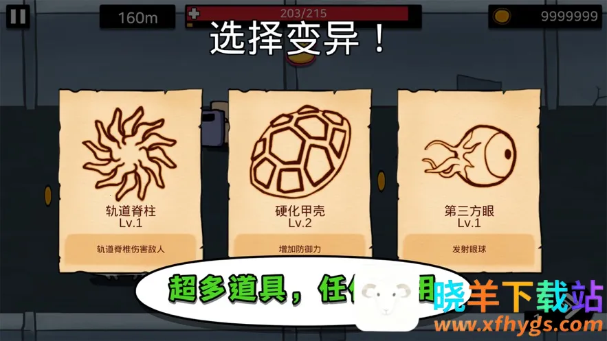游戏玩法独特,通过吞食肉类进化身体和能力,类似游侠风格的跑步游戏,具有动态突变功能。玩家可选择金属元素强化标本,每张变异卡最多叠加3次。沿途收集金币提升怪兽能力,挑战结束后开启宝箱获得随机装备。