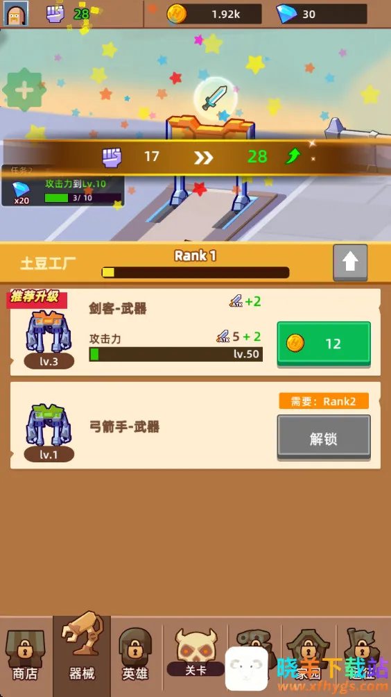 这款游戏融合了放置塔防与模拟经营等元素,玩法丰富有趣。你将扮演英雄制造工厂的厂长,制造英雄军队并部署部队战胜敌人,还能升级工厂为自动流水线。