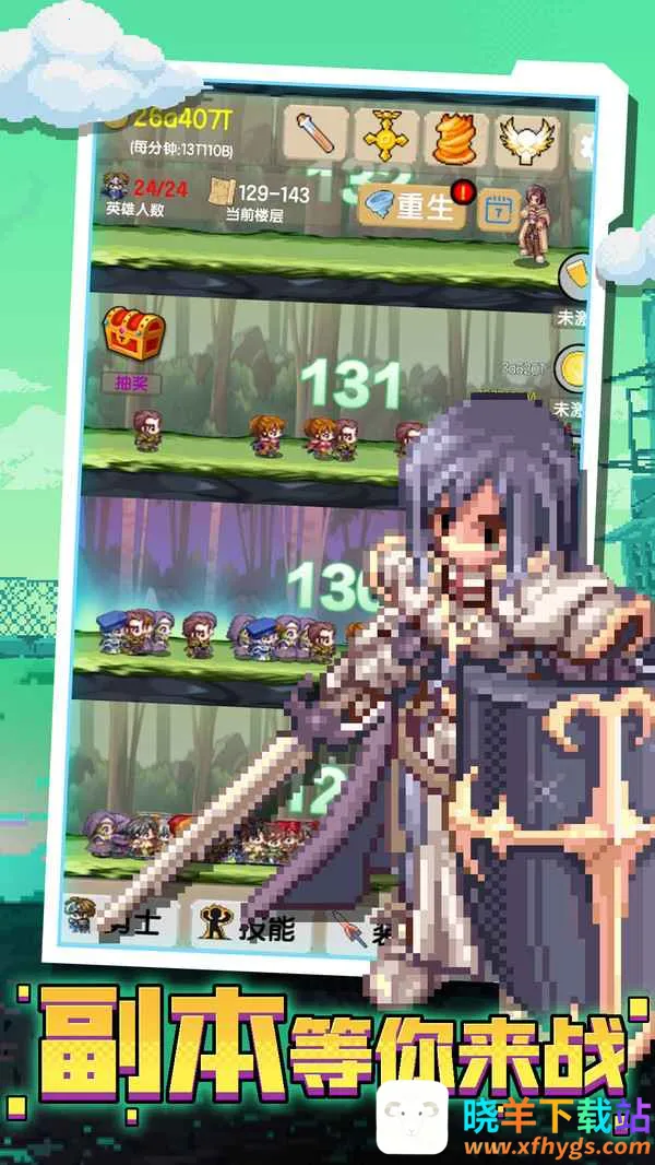一起来爬塔官方版是卡通画风的冒险游戏,操作简单易上手。玩家招募培养勇者组队闯关,收集装备强化实力。游戏有像素冒险、挂机放置等特色,含多种武器道具,关卡丰富,策略烧脑,乐趣十足。