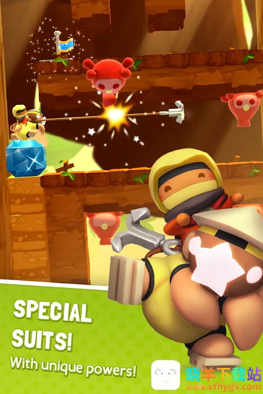 2、炫酷套装随心更换:多达29种炫酷套装,随意更换。每种套装都有独特能力,升级后能获得超级力量。用不同套装玩同一关卡会有完全不同的体验,助你在冒险中所向披靡。