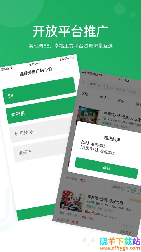 4. 外部赋能:一键同步58幸福里房天下等流量平台,超完善的分享工具,实时结算系统佣金,完善的权证售后体系等。