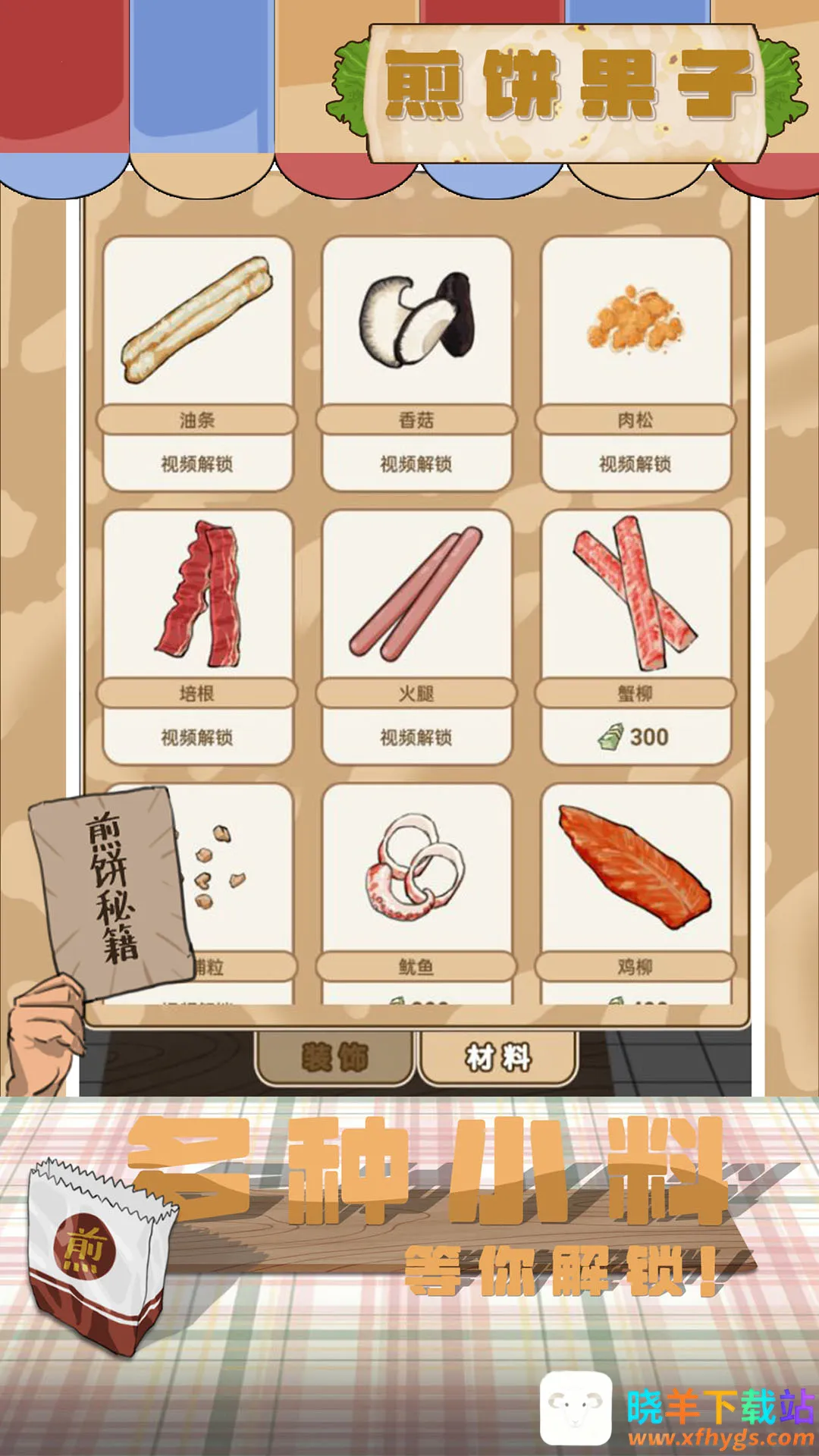 想知道煎饼果子怎么做?来试试这款超好玩的模拟经营游戏吧!在游戏里,你就是煎饼摊摊主。操作超简单,各种食材任你点击选择。每隔一段时间就会有不同顾客上门,需求各不相同。你得根据客人要求,把煎饼做得让他们满意,完成任务就能赢奖励、赚金币。游戏画面是可爱的卡通画风,场景精致,还有休闲舒适的背景音乐,给你全新烹饪体验。从准备面粉、淀粉、盐、鸡蛋、葱末、油这些材料,到把握火候、添加各种馅料,都能让你体验做煎饼的完整流程。在这里,你不仅能学会做煎饼,还能听顾客们的精彩故事,感受经营小店的乐趣,快来下载,开启你的煎饼制作之旅吧!
