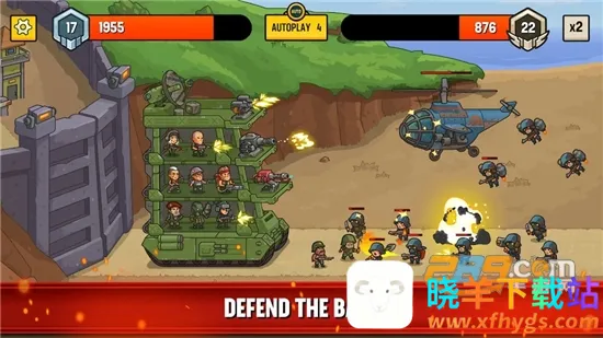 这是一款以战争为题材的策略手游,玩家将化身为指挥官,运用谋略在战火纷飞中取得胜利。游戏画面采用精致卡通风格,搭配雄壮背景音乐,能快速将玩家带入战争氛围。在游戏里,玩家要指挥军队保护基地,可派遣步兵、导弹、机关枪等各种类型士兵,甚至能调遣飞机和坦克。双方血量实时显示在屏幕正上方。随着游戏推进,敌人会越来越强大,后期不仅有直升机攻击,还会出现各种兵种。玩家需通过战斗获取金币,升级坦克兵种、解锁其他兵种,不断调整阵型和武器,以应对不同战斗,最终成为战争胜利者。游戏具有离线策略玩法,无需互联网,还有丰富任务模式和多样化关卡,带来精彩射击大战。