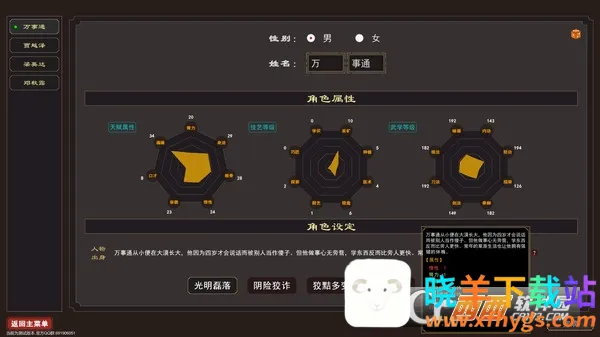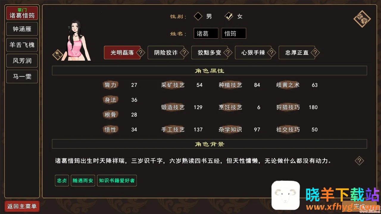 在角色养成方面,有独特设定。开局roll点很关键,基础属性影响后期战斗,弟子技艺等级关乎门派发展。还能自己diy人物,不同魅力值有不同人物描述,多种性格也会影响武学学习。