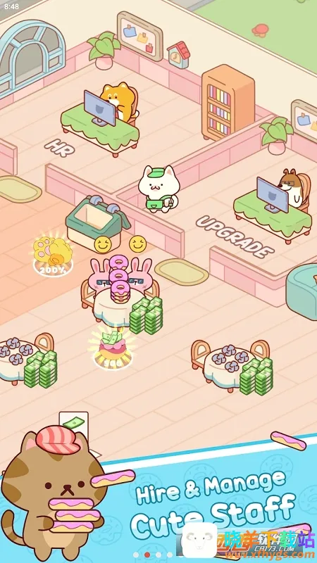 3. 萌系视觉与互动:采用可爱卡通画风,猫形顾客和店员自带治愈属性,能解锁服装装饰打扮店员,互动细节满满,营造温馨氛围。