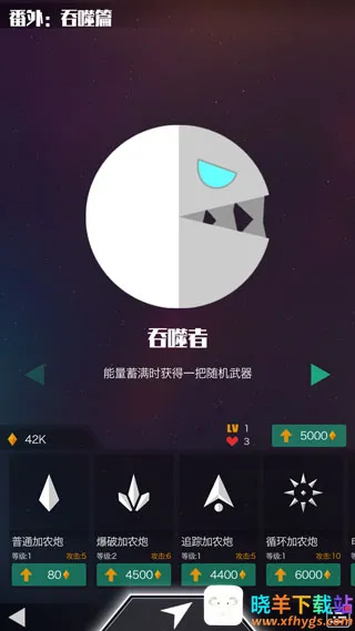 真弹幕模式:游戏中吃弹幕便能攒能量,待攒满能量后即可随机出一种武器或无敌时间,武器进攻Boss,无敌啃爆Boss。部分武器可以消除骷髅子弹。