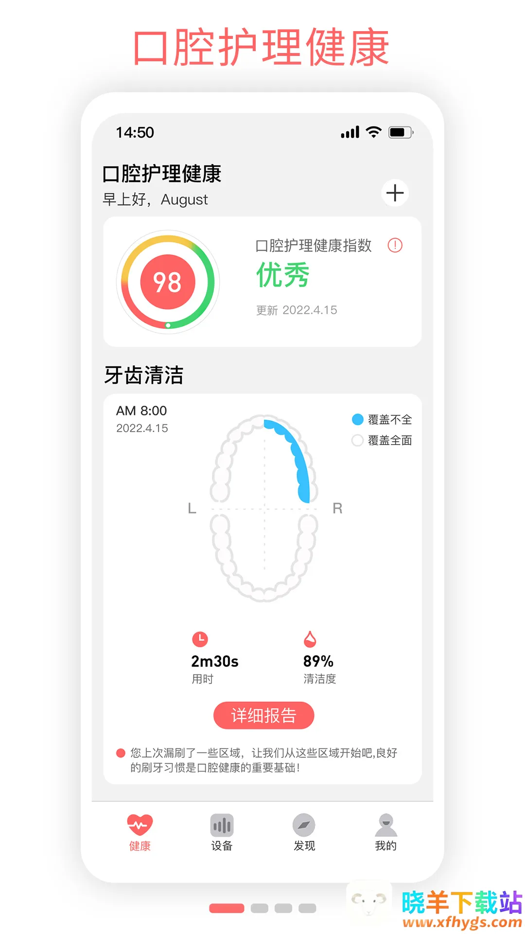用户反馈中提到,该软件能配合智能硬件提供口腔护理健康指数指引,记录刷牙、冲牙数据,帮助养成刷牙好习惯。设备页可设置连接、功能、刷牙方案等,还能在App商城购买产品。发现页有口腔小科普等内容,也可查看设备、订单状态,实现售后服务。