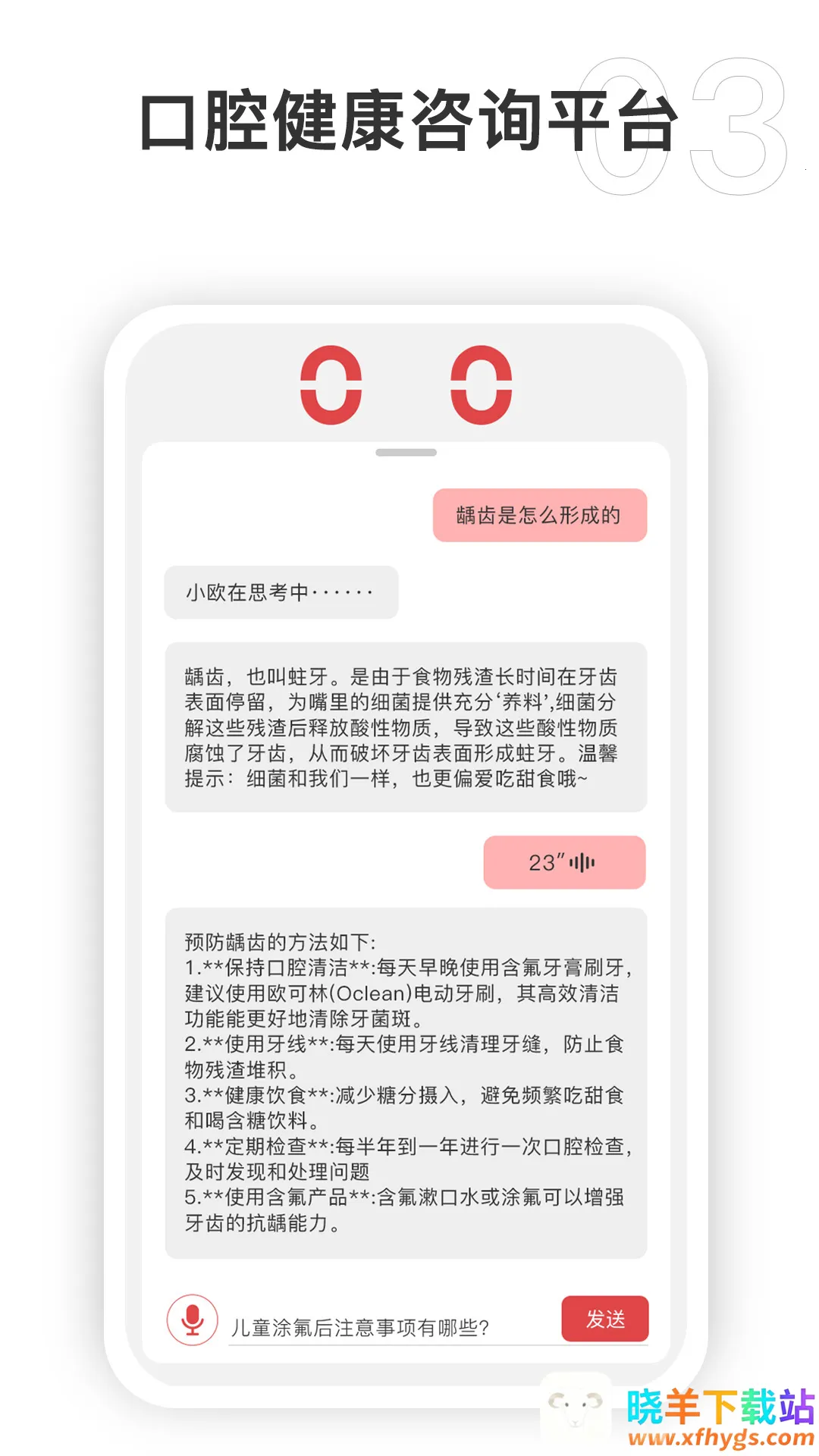 Oclean Care2026官方最新版本特色满满。它全新升级,交互界面直观,操作流程优化,带来流畅便捷体验。独特的AI对话功能,沟通自然高效,仿若与专业口腔医生交流。AI日常护理追踪更精准,能提供个性化、科学化护理建议。全新的AI口腔检测与分析功能,敏锐发现潜在问题并给出针对性方案。家庭空间功能强大,支持多设备多数据便捷查询管理,全方位守护口腔健康。