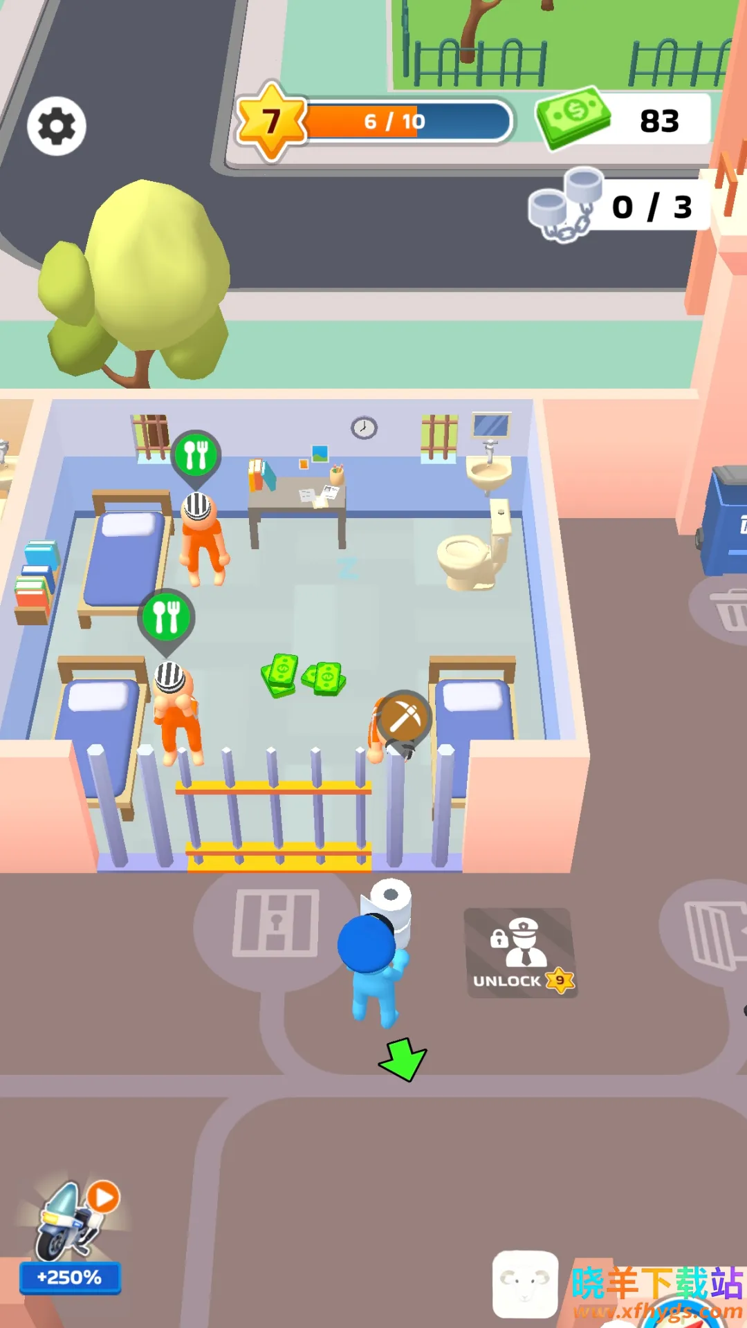 游戏玩法丰富多样,玩家需要跟随箭头指引完成初始设施建造,合理安排床铺,分配狱警工作任务,维持监狱日常秩序。同时,玩家还需要规划资源扩大监狱规模,解锁新区域,稳步推进监狱发展。