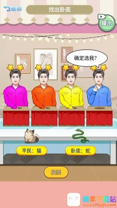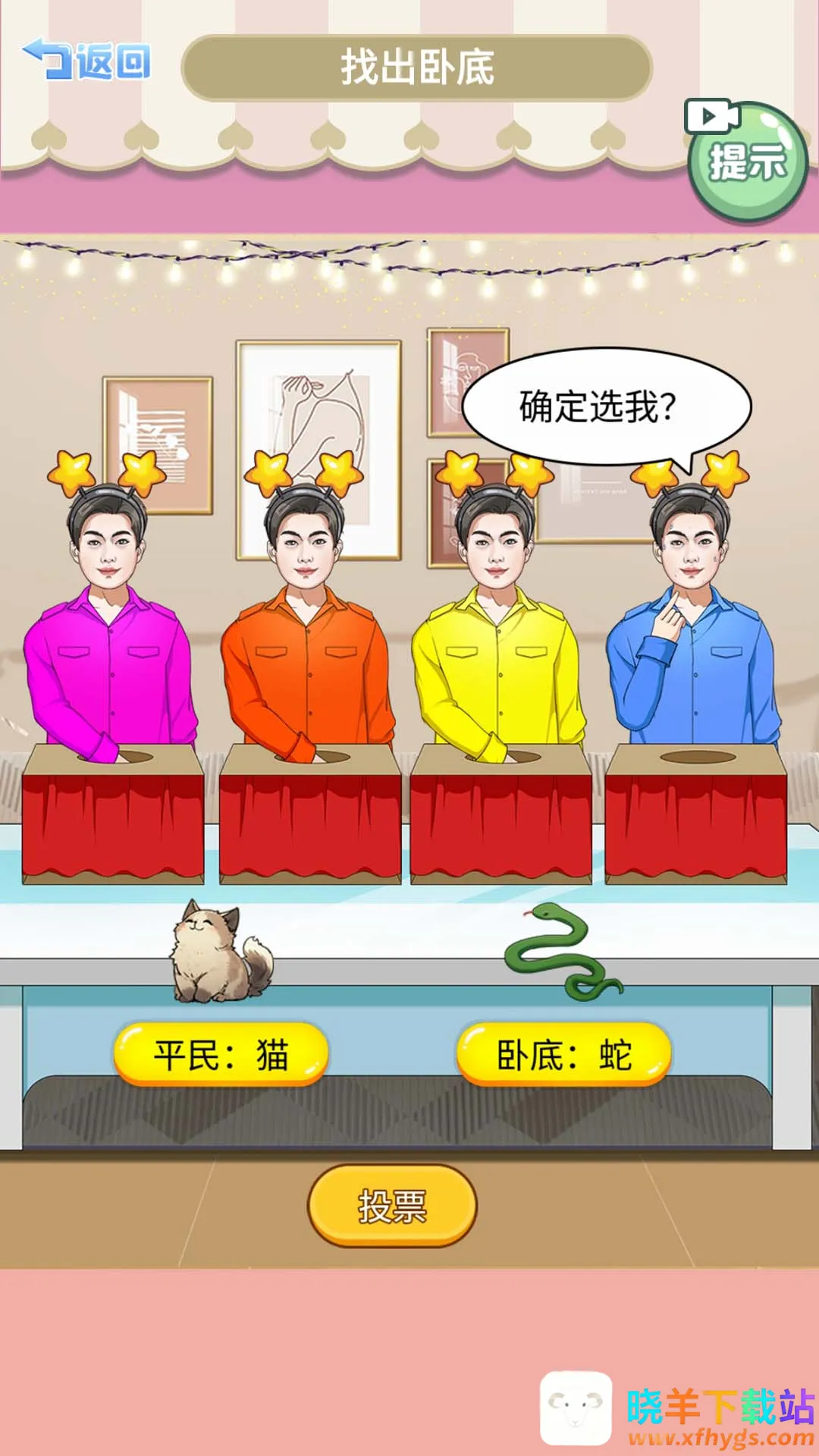 “查出卧底”特色十足。它规则简单,各年龄段玩家包括新手都能迅速上手。设有多样场景和关卡,增加了多样性与回放价值,每次都带来新挑战。游戏过程中,难度会逐渐增加,激发玩家挑战欲望。玩家需通过分析线索、观察团队成员言行举止来推断身份找出卧底。这种独特玩法,让玩家在不同背景下推理判断,趣味性和挑战性极高,能充分释放推理想象力,还适合家庭互动,加强亲子关系,是一款不可多得的益智游戏。