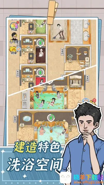 游戏画风简约温馨,玩法经典有趣。在这里,你能自由选择低调现代风或豪华复古风来装修浴场,合理安排设备配置,像游泳池、大型浴室、抓娃娃机等。各种稀奇古怪的沐浴方式层出不穷,从红酒沐浴到咖喱沐浴,每种都独具魅力。而且还能分级培训员工队伍,提升服务品质。